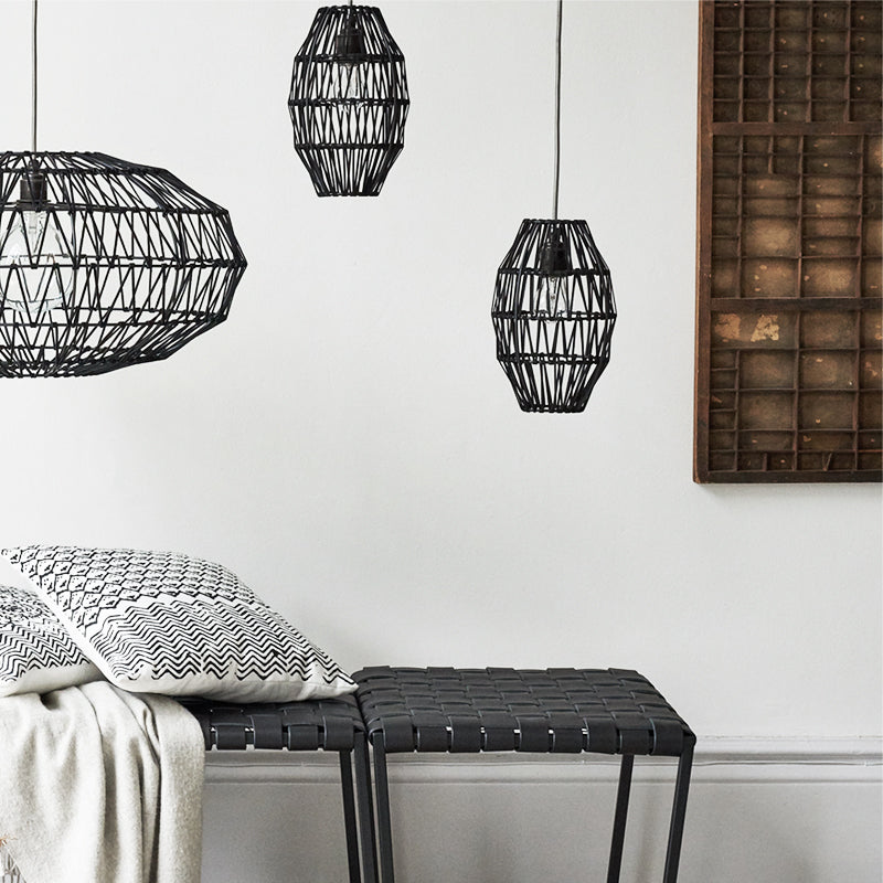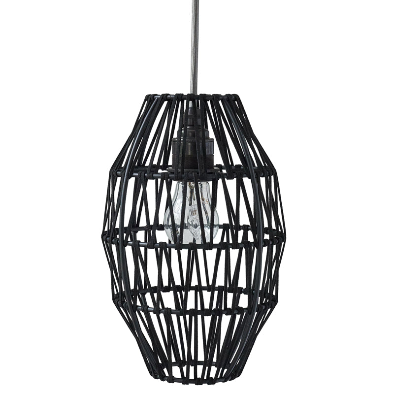 The alp light 310 has a black powder coated metal frame with black suede-like cord weave.