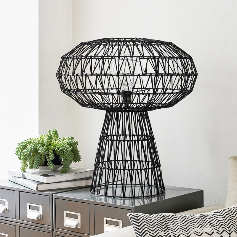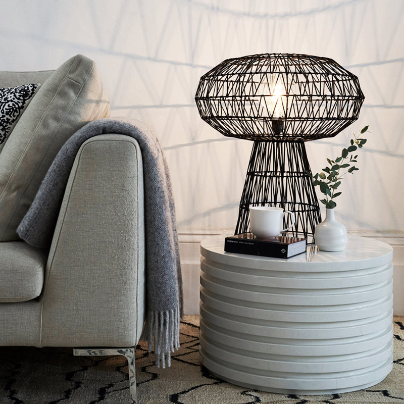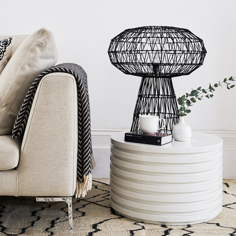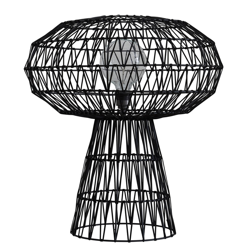 The alp table lamp 310 has a black powder coated metal frame with black suede-like cord weave.