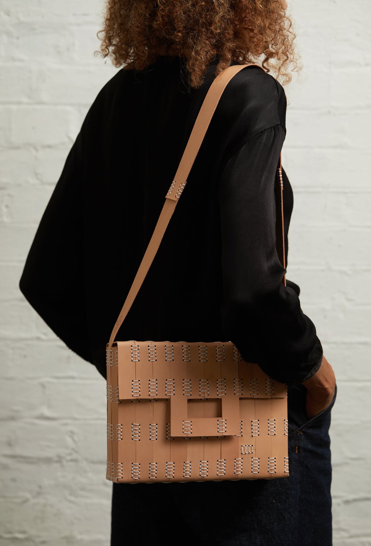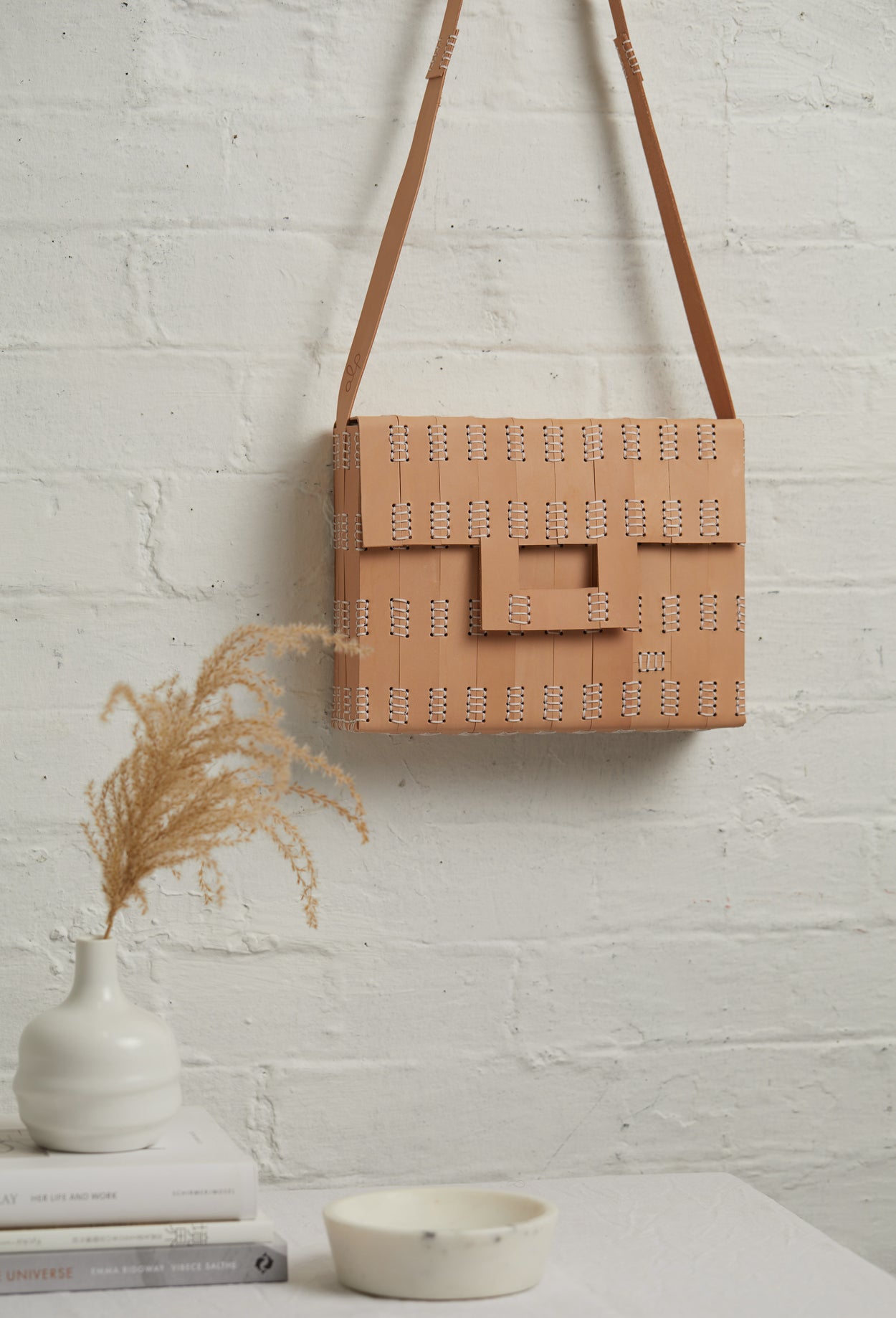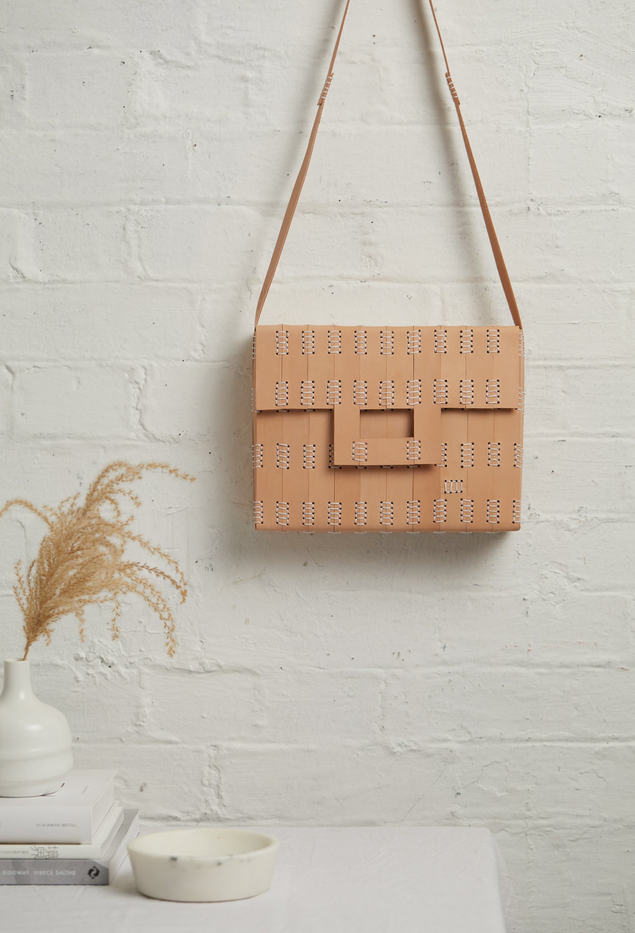 Annick enjoys the contrast of the materials and is playing with the opposite textures of the smoothness of the natural leather and the patterns created by the white waxed thread.