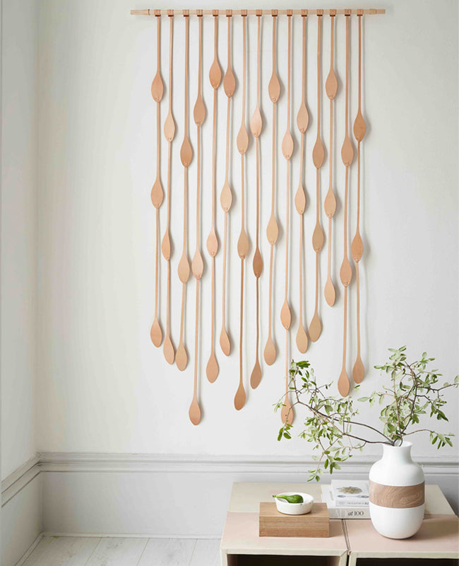the alp screen 605 is made of leather offcuts from the studio and our leather supplier. It was done during these last few winter months, inspired by the rain. It can be used as a wall panel or a room divider. The leather being a natural product will age beautifully and gain a deeper tone over the years. As this is made by hand, each screen is unique and slightly different.