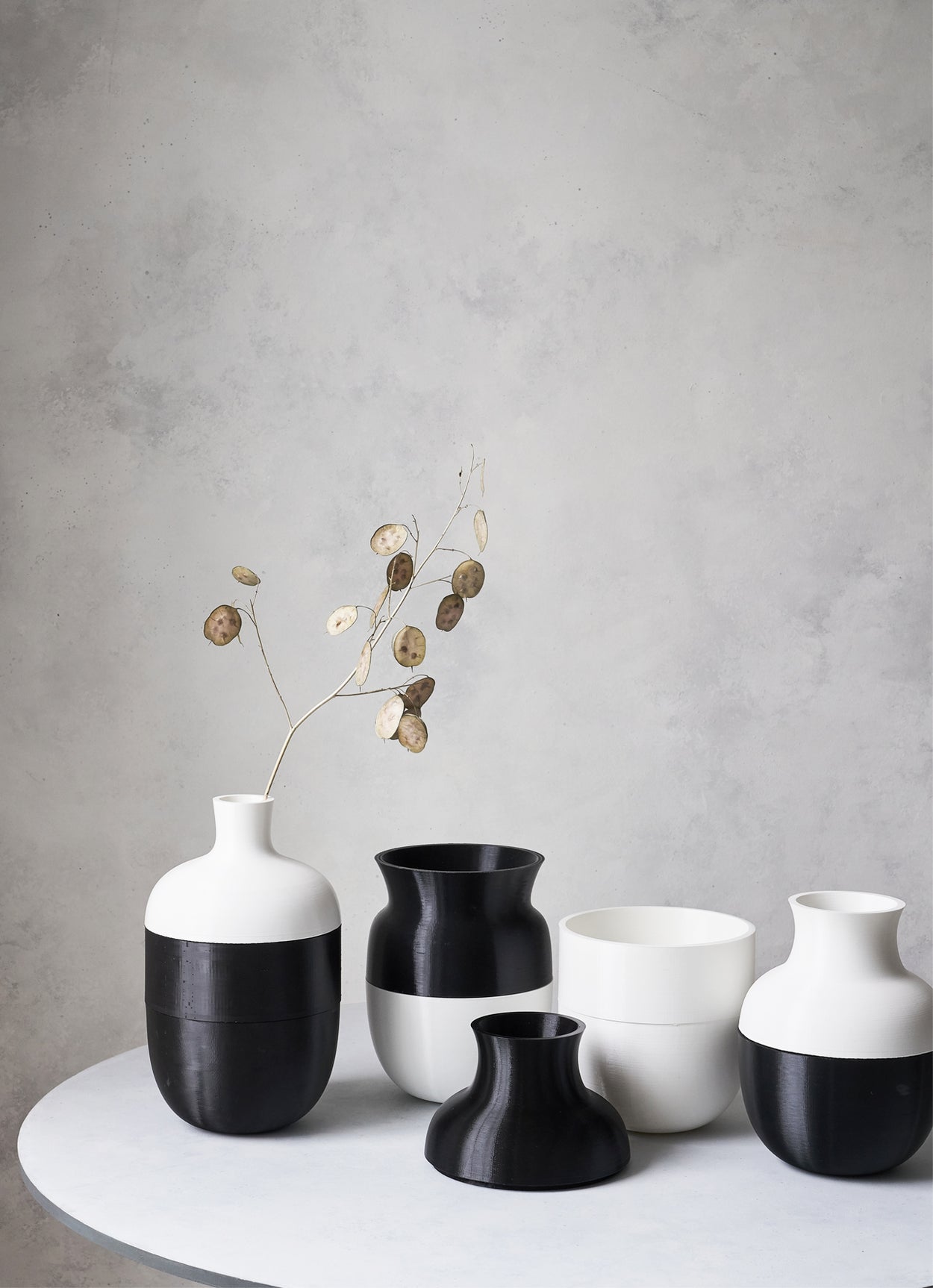 Create your own vase by selecting 5 parts (1 base, 1 middle part, 3 different top parts) in the colours you fancy, white, black or now blue and add a middle part in turned Ash wood.