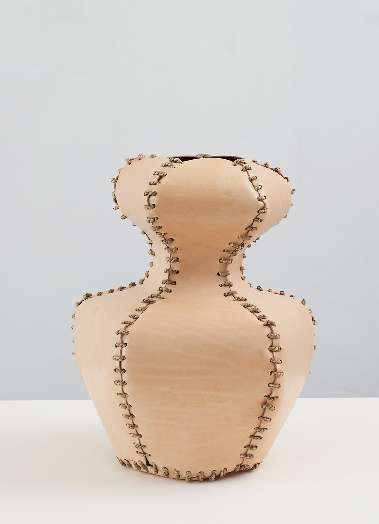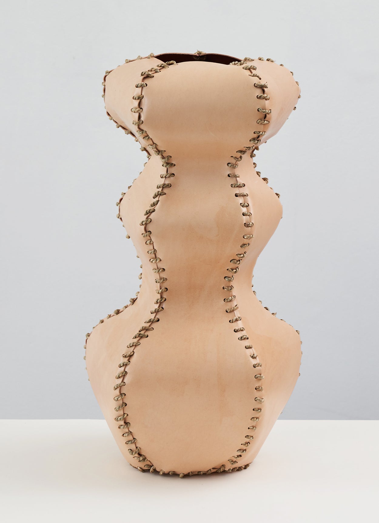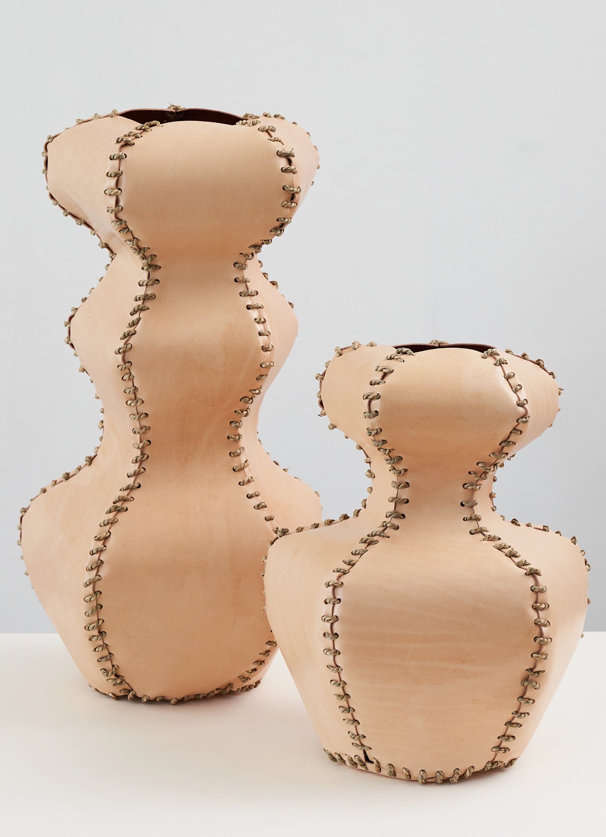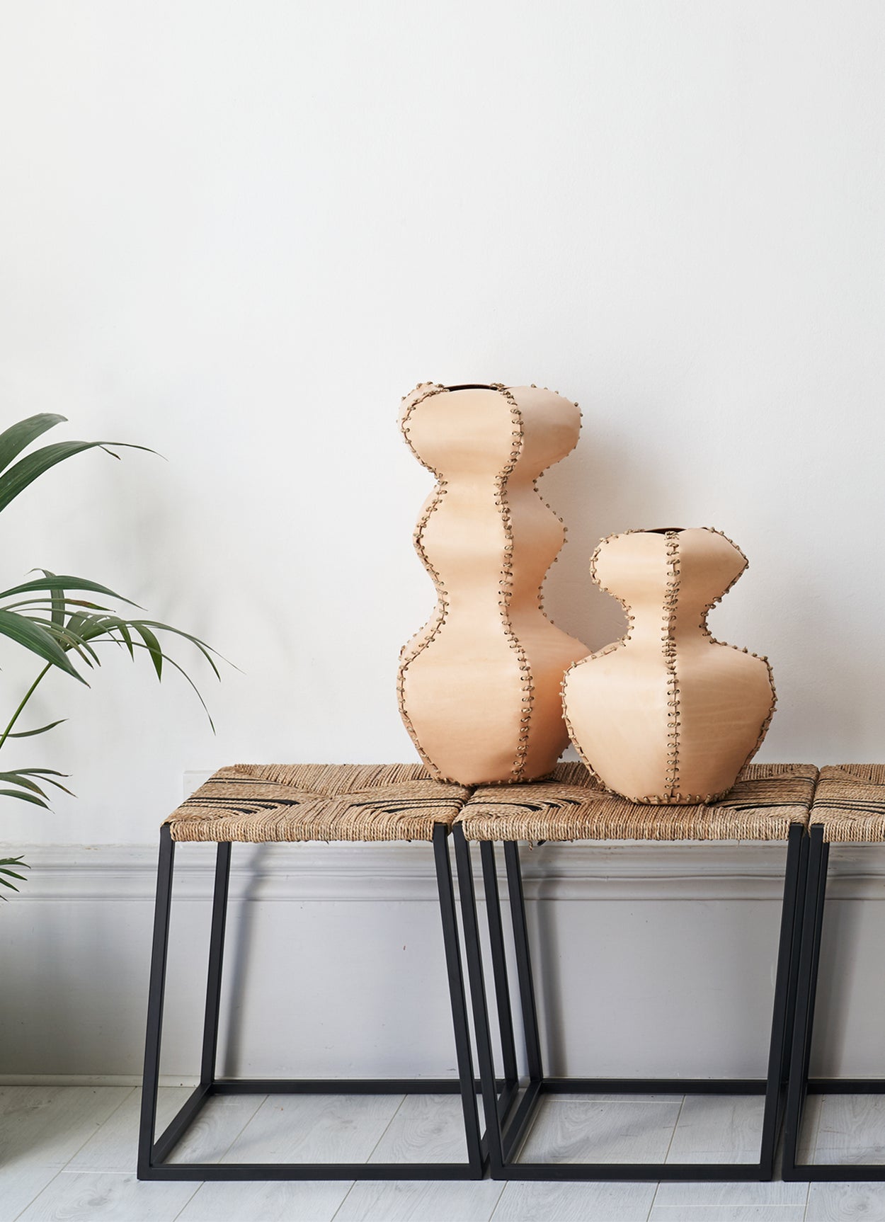 The alp vessel 510 is made from leather offcuts stitched together with seagrass cord. They are objets in their own right or can receive dried flowers.