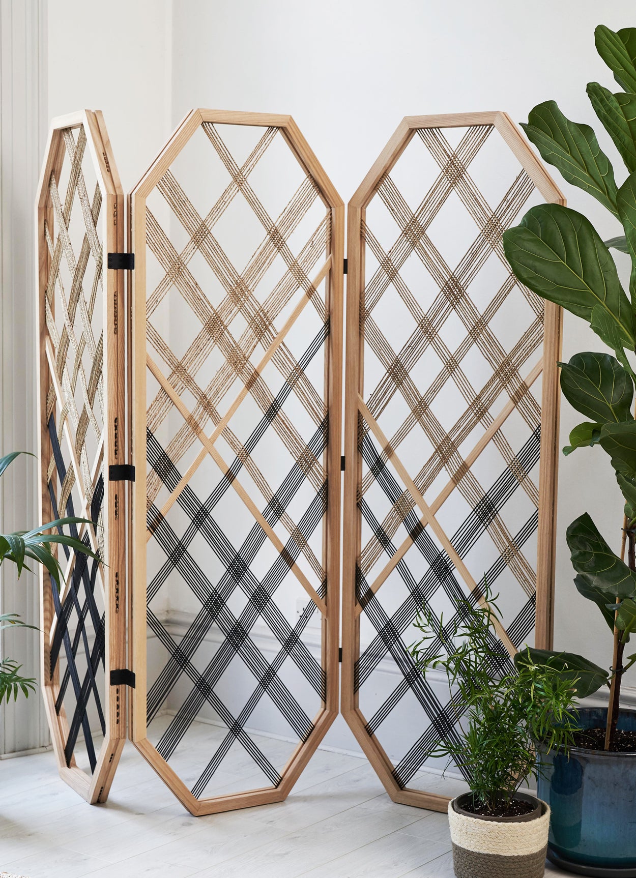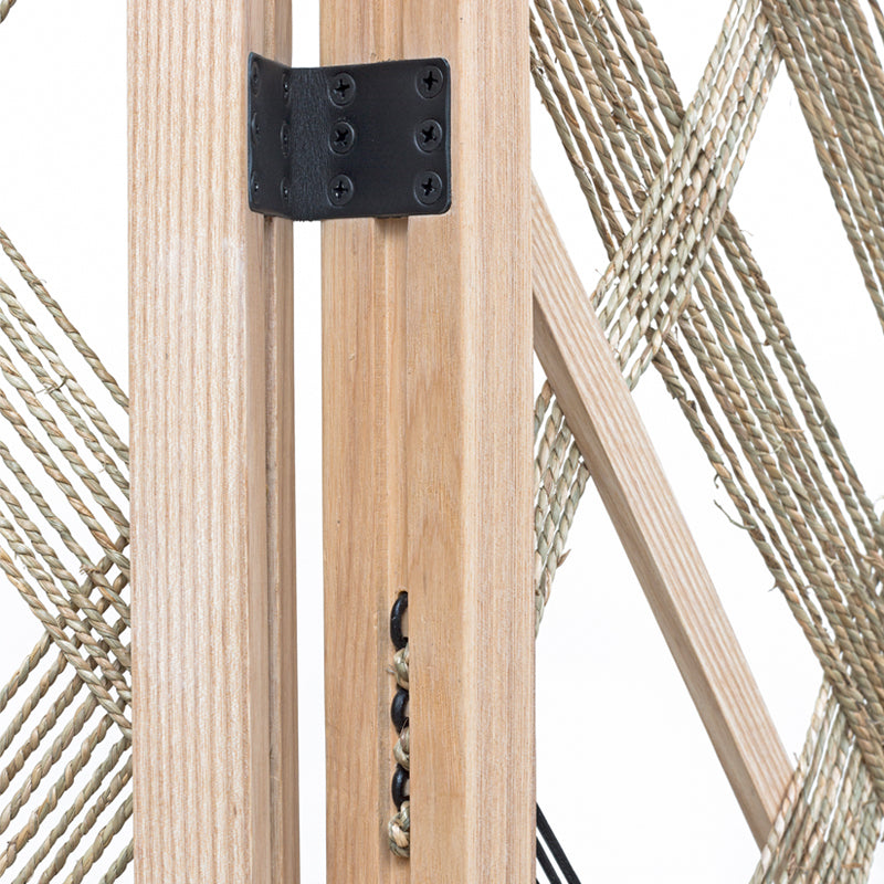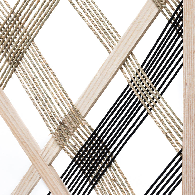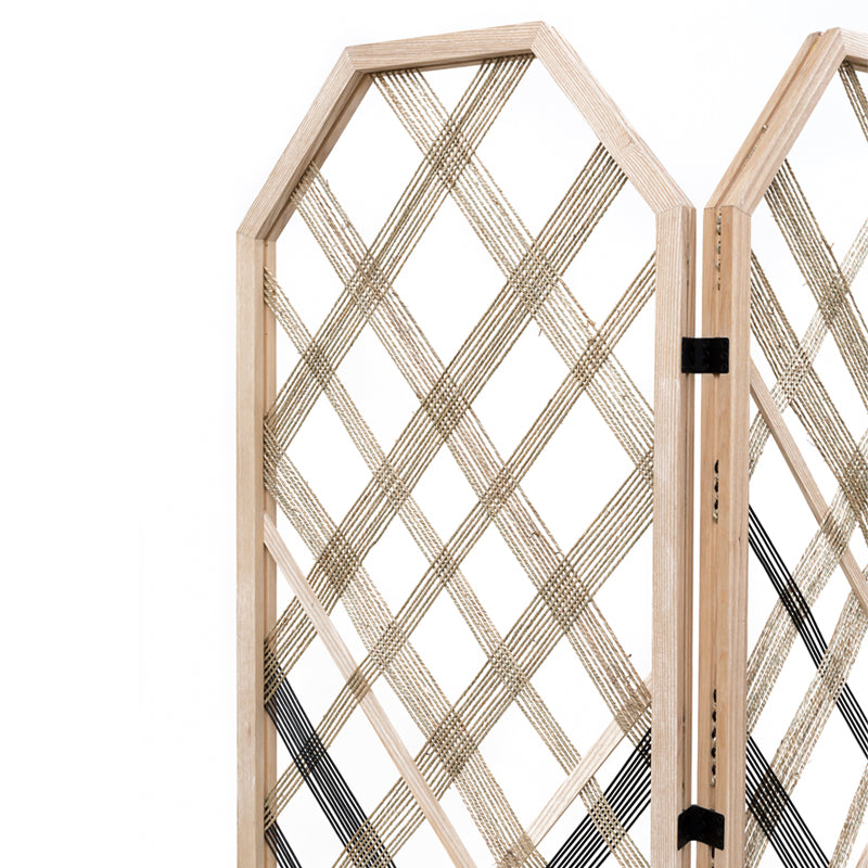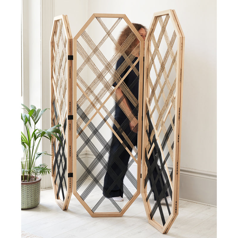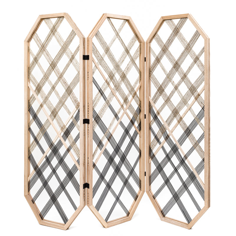 The alp room divider 123 has 3 foldable panels made in ash wood with natural fibre cord and black leather cord weaved trough it. It creates a light space divider with diamond shape patterns.