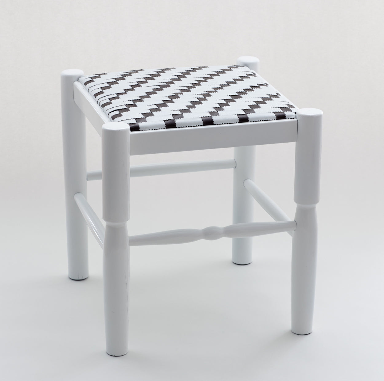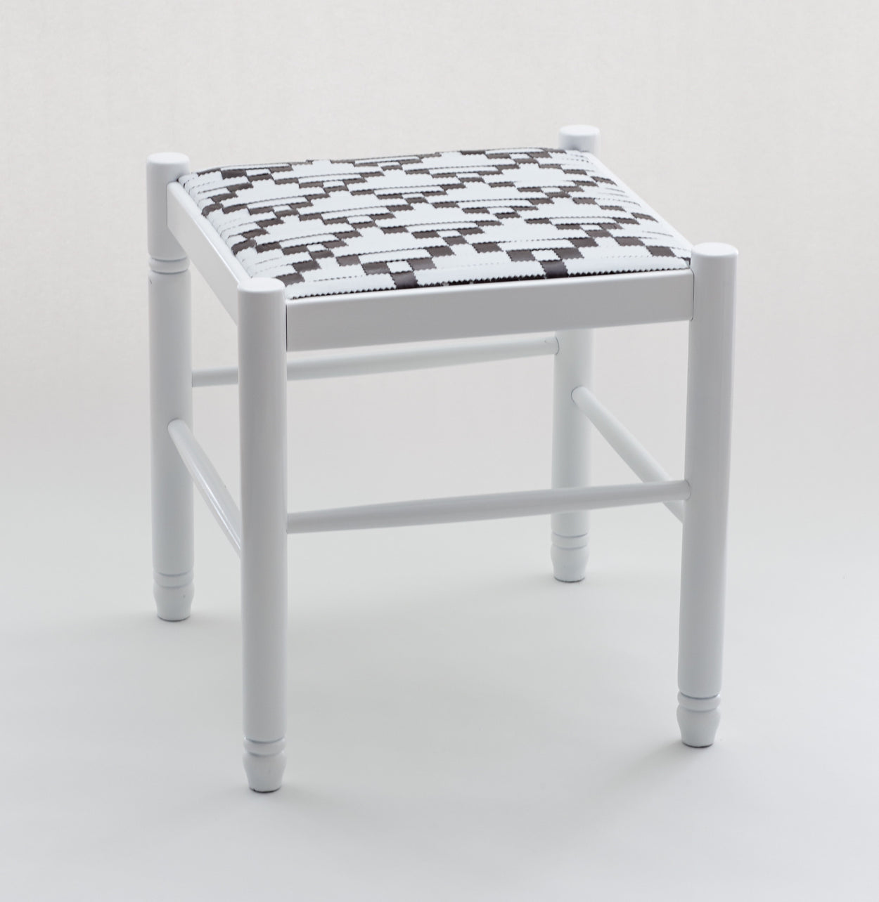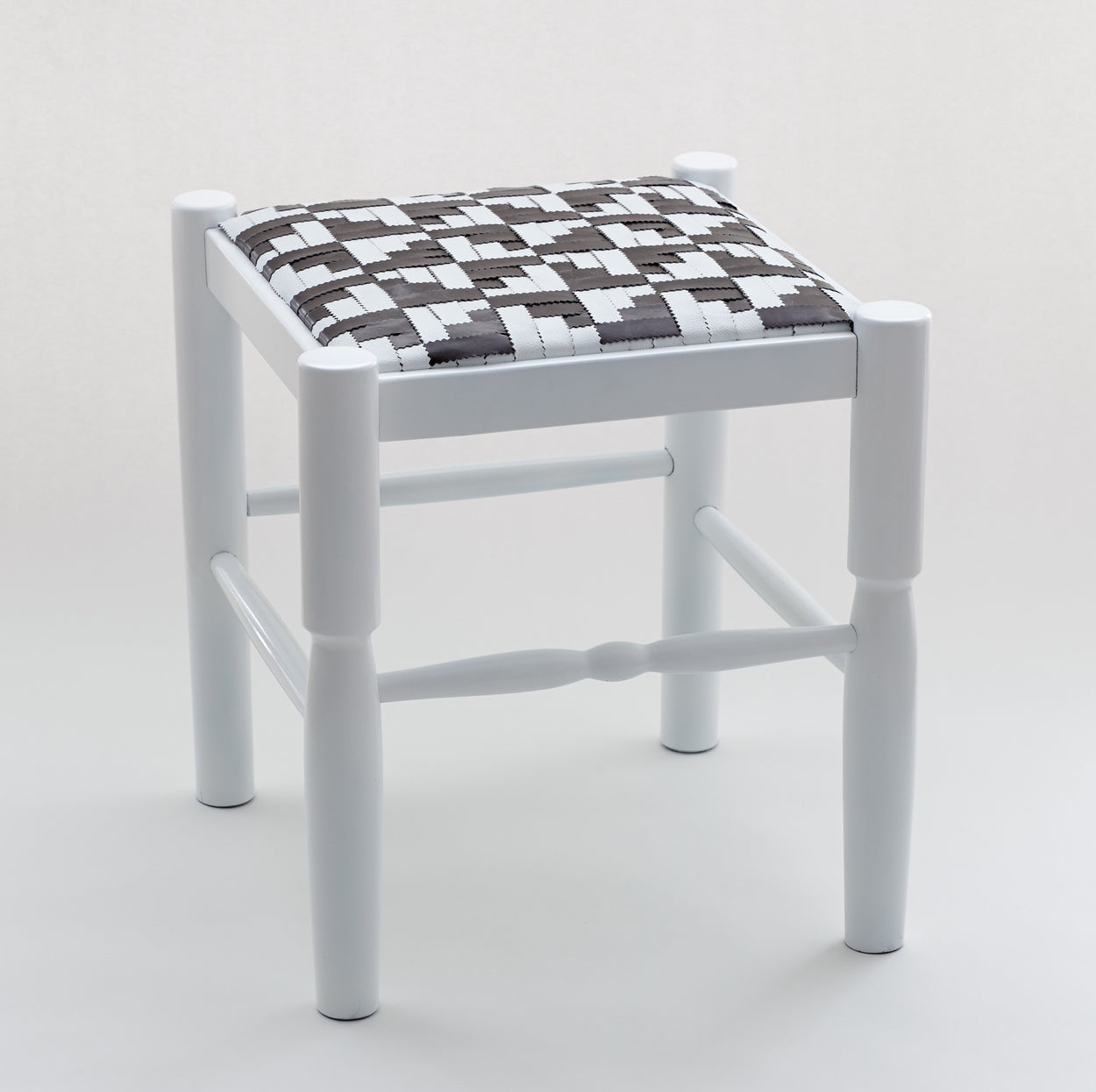 The alp stool 103 is made by using old chairs that are being upcyled to become beautiful unique stools. They have a choice of 3 different leather weave seats in white and dark grey stripes, grid or geometric.